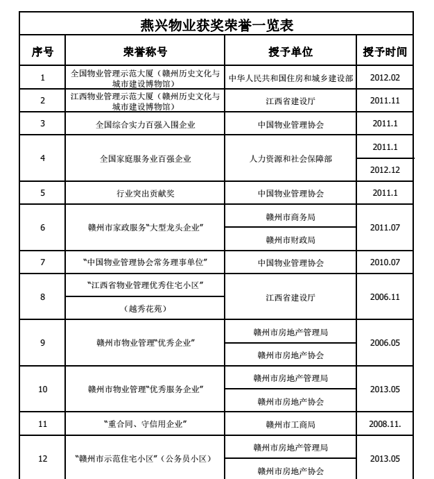 燕興物業(yè)近年來獲得榮譽(yù)證書及獎(jiǎng)牌
