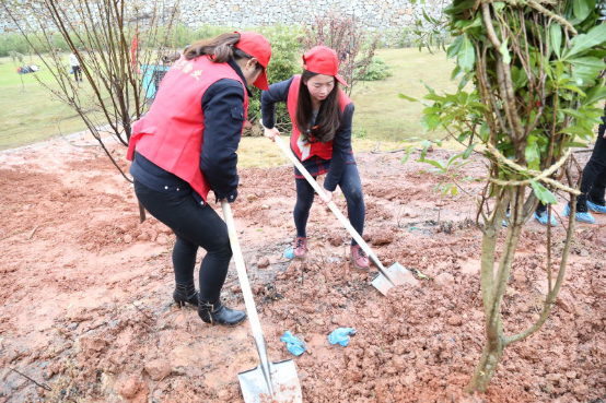 雖是陰雨綿綿的天氣,卻阻擋不了伙伴們的熱情,志愿者們熱情高漲,在分發(fā)植樹工具后,大家2人一組,合理分工,馬上行動起來。在植樹現(xiàn)場,大家不怕臟,不怕累,團結(jié)一心、齊心協(xié)力,將一棵棵樹苗小心的擺放在坑里,扶苗、填土、休整動作連貫有序,整個現(xiàn)場氣氛熱烈,歡聲笑語一片。