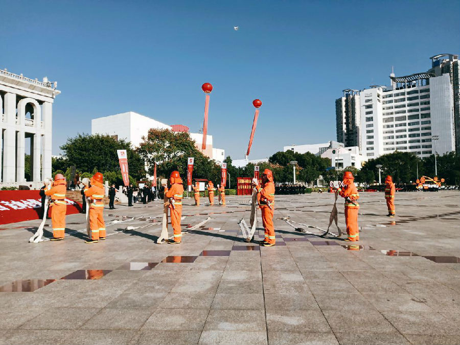 隨后,舉行的技能演練展示精彩紛呈,臺(tái)下口號(hào)震天,臺(tái)上掌聲一片。集體捕俘拳演練主要展示了分解和連貫兩個(gè)動(dòng)作,他們以拳、步、擋、削等進(jìn)攻敵方要害,出拳動(dòng)作干脆,招招制敵要害;消防器材操作演練主要展示了5組10人二節(jié)水帶的展開(kāi)、連接、收回等動(dòng)作,手法嫻熟,一氣呵成;交通指揮手勢(shì)演練主要展示了停止、直行、左轉(zhuǎn)彎、左轉(zhuǎn)彎待轉(zhuǎn)、右轉(zhuǎn)彎、變道緩行、減速慢行、示意車(chē)輛靠邊停車(chē)等信號(hào)手勢(shì);警棍盾牌操演練則主要展示了劈、戳、撩、掄、掃等警棍基本動(dòng)作和頂、挑、切、擋、砸、架等盾牌基本動(dòng)作;管家禮儀演練主要表演了《物業(yè)禮儀操》。