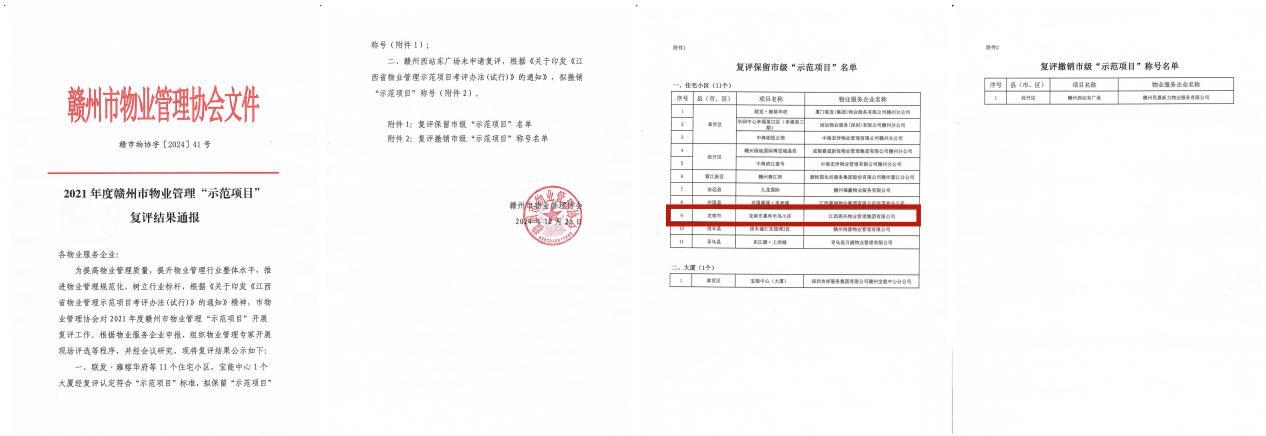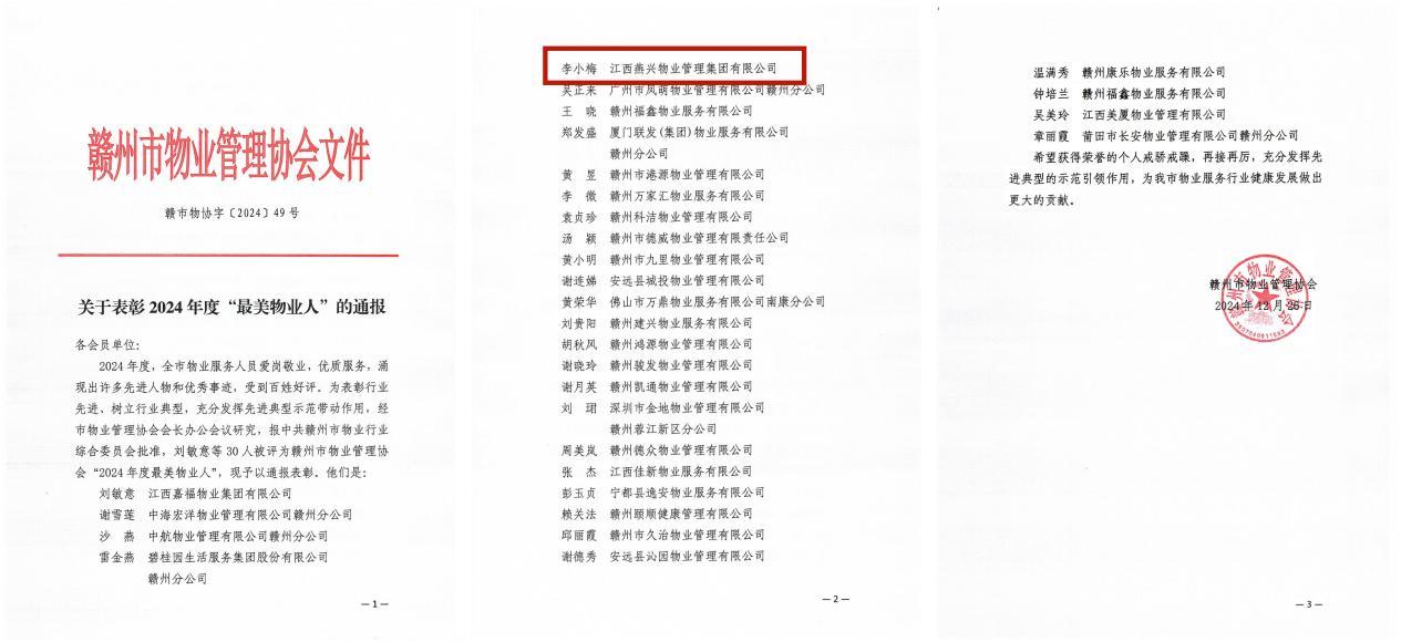 2025年元月7日,贛州市物業(yè)管理協(xié)會第五屆三次會員大會在贛州市格蘭云天國際酒店勝利召開,會上對2024年度優(yōu)秀物業(yè)企業(yè)及個人進行了通報表彰。燕興物業(yè)喜獲贛州市“2024年度優(yōu)秀物業(yè)企業(yè)”“2024年度誠信自律企業(yè)”“2024年度支持文明城市創(chuàng)建先進企業(yè)”榮譽稱號;龍南嘉和半島小區(qū)復(fù)評通過“贛州市優(yōu)秀示范小區(qū)”,項目經(jīng)理周群蓉喜獲“2024年度優(yōu)秀物業(yè)項目經(jīng)理”榮譽稱號,公園壹號小區(qū)物管員李小梅獲得“最美物業(yè)人”榮譽稱號。