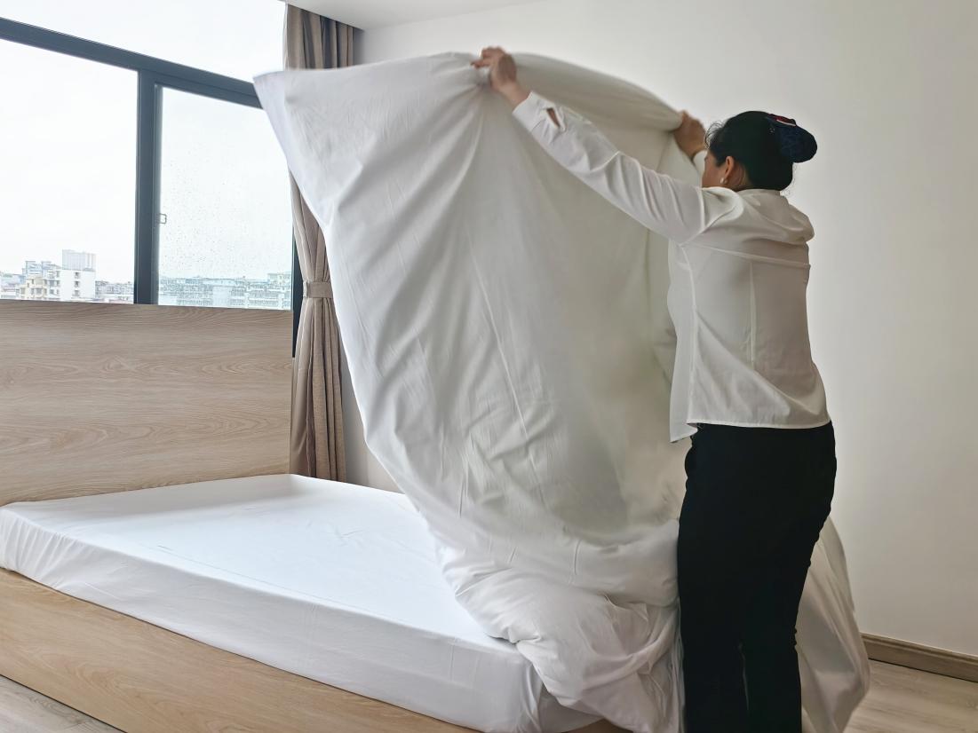 比賽現(xiàn)場(chǎng),參賽服務(wù)員們迅速進(jìn)入“戰(zhàn)斗”狀態(tài),在緊張而有序的氛圍中大展身手。隨著一聲令下,他們動(dòng)作嫻熟、一氣呵成:雙手輕揚(yáng),潔白的床單如靈動(dòng)的蝶翼在空中翻飛,轉(zhuǎn)瞬便平整地鋪展在床上;緊接著,套被套、折被角,每一個(gè)步驟都精準(zhǔn)到位,盡顯扎實(shí)功底。經(jīng)選手們精心塑造,原本松散的被芯變得棱角分明、挺括有型,將標(biāo)準(zhǔn)化服務(wù)流程與藝術(shù)美感完美融合。評(píng)委們秉持公平公正原則,從操作規(guī)范程度、完成效率、細(xì)節(jié)處理等多個(gè)維度進(jìn)行細(xì)致評(píng)分,不放過任何一個(gè)細(xì)節(jié),確保賽事結(jié)果真實(shí)反映選手水 平。