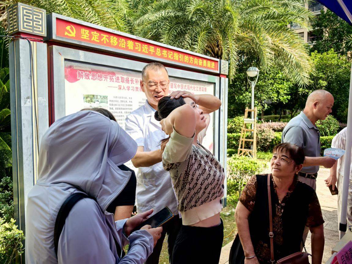 在中醫(yī)技術體驗區(qū),醫(yī)護人員都展現出高度的專業(yè)素養(yǎng)與耐心,通過望、聞、問、切,對居民的面色、舌象、脈象及癥狀等進行綜合判斷,辨識其體質類型,免費開展的針灸、艾灸和耳穴等項目吸引了眾多居民駐足體驗,為居民提供針灸治療,調節(jié)經絡氣血運行,緩解疼痛、改善癥狀。不少體驗后的居民紛紛表示,身體的一些不適得到了明顯緩解,對中醫(yī)的神奇療效贊不絕口。